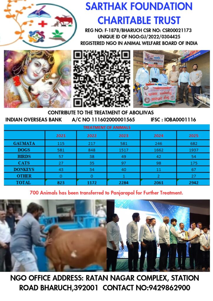 Sarthak Foundation Charitable trust is an NGO that works for medical assistance to injured animals in the Bharuch, Ankleshwar and Dahej area. Moreover, the organization is also committed to development of society through social and cultural activities.
