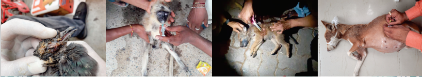 Our NGO is committed in providing medical assistance to injured animals. Whenever a request for medical attention of an animal is received our NGO team members reach the provided place and our first aid team member examines the extent of injury. According to the injury, first aid is provided to the injured animal which may include applying medication, dressing wound or plastering of injured part. In cases where injection maybe required a qualified doctor who is certified to give injection is contacted and brought to the provided address by our NGO team members. If the injury is severe then the animal is sent for further treatment to the nearby hospital for further treatment. Our NGO only sends the animals to the speciality hospitals that have been working for the treatment of animals for years. Karjan Panjrapol hospital is one such hospital that works for the treatment of badly injured animals. In the same way Chappad hospital is commited for the treatment of dogs.