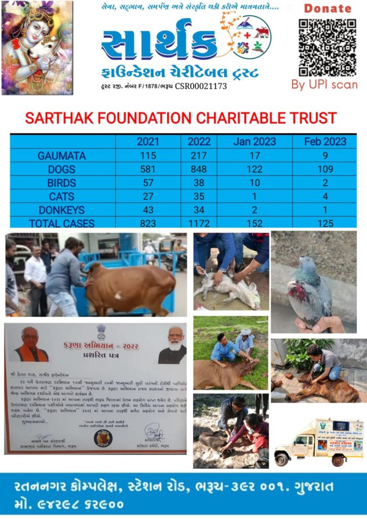 The following list of number of animals were given first aid during the year by Sarthak Foundation